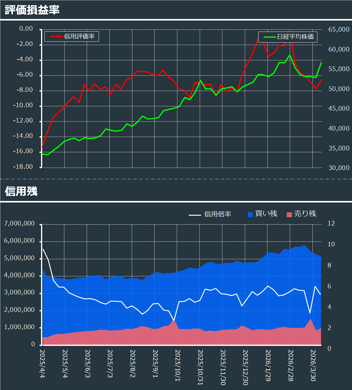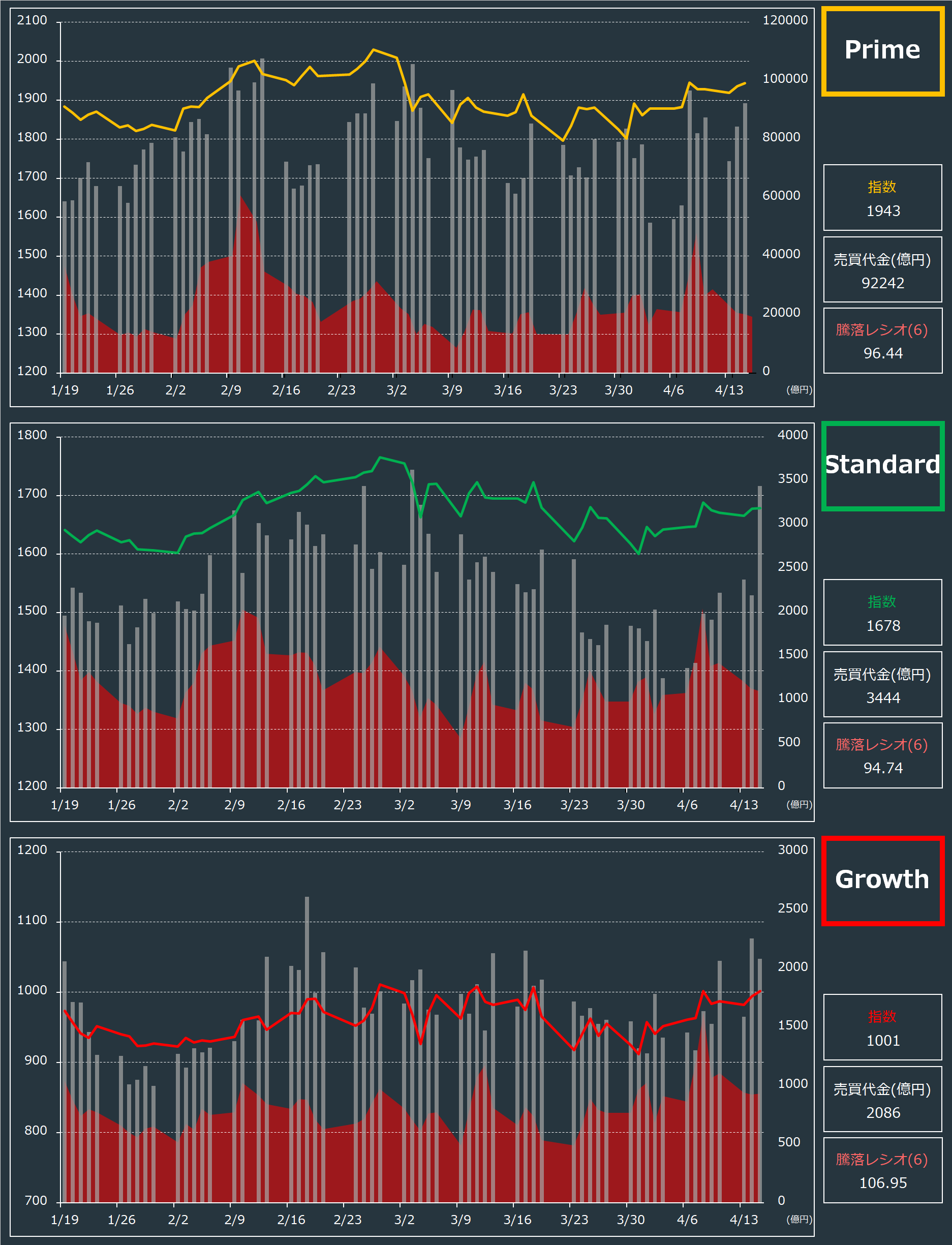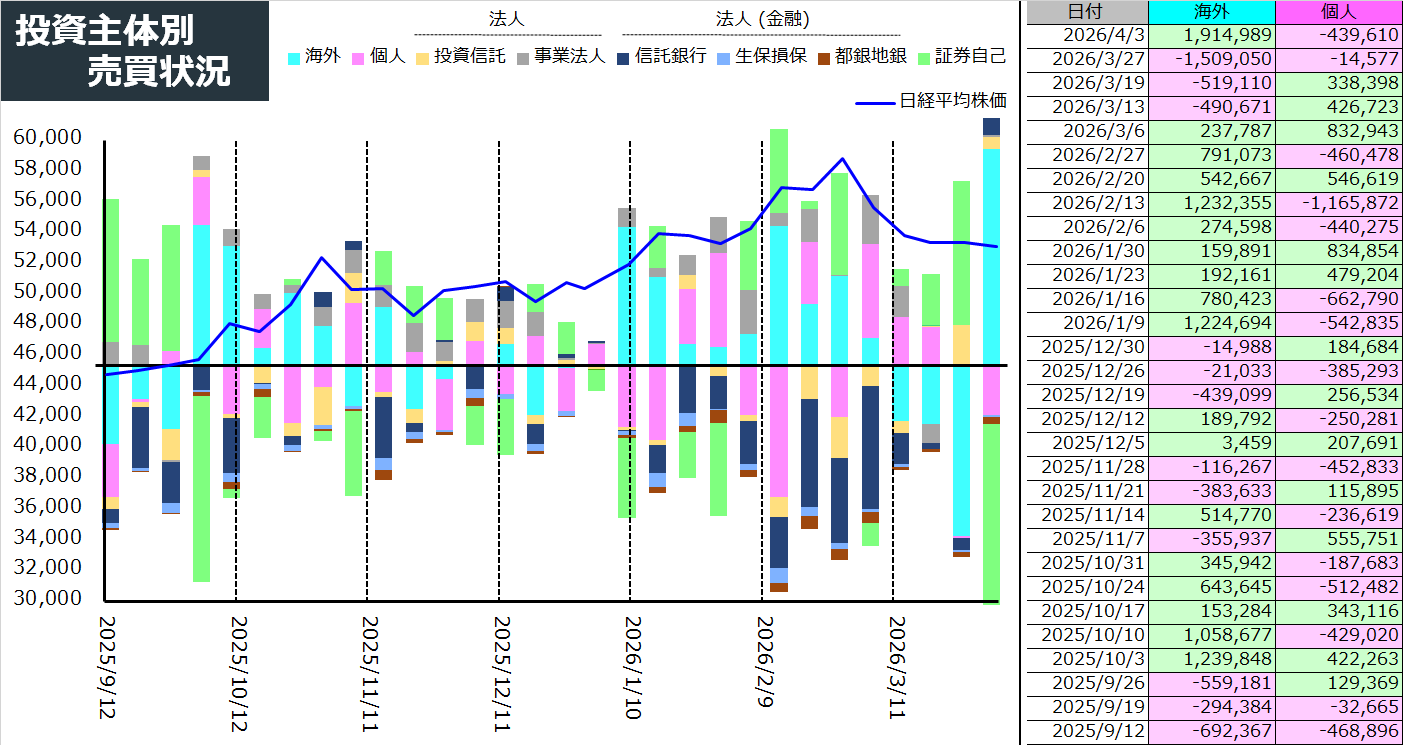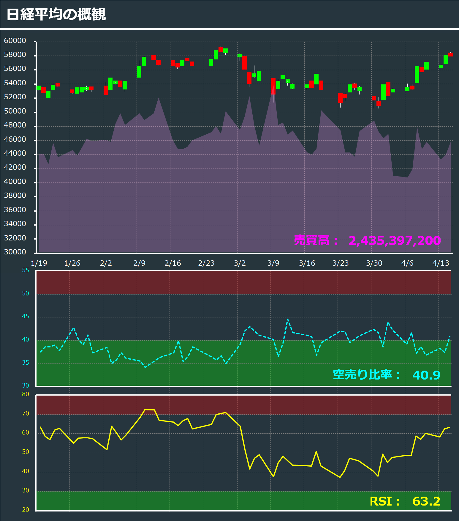 株式投資2021.10.11 2026.04.15 integral-777 本日の振り返り 更新日:2026-04-15_18:46:32 日経平均の概観・日経平均とTOPIX・市場区分比較・売買代金と騰落レシオ・投資主体別の売買状況・業種別RSI・業種別空売り比率・評価損益率 信用残 コメントを残す コメントをキャンセルメールアドレスが公開されることはありません。 ※ が付いている欄は必須項目ですコメント ※ 名前 メール サイト Δ